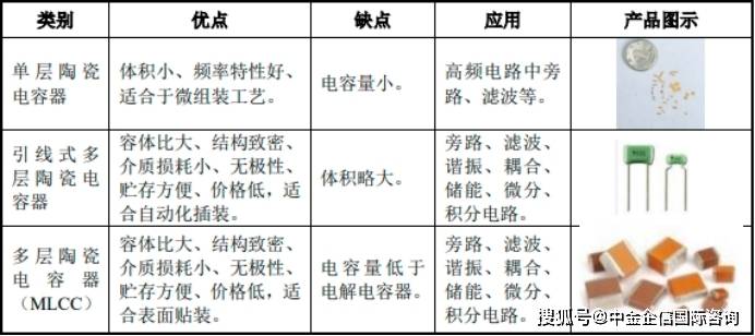 ②MLCC行业概述:陶瓷电容器可进一步分为单层陶瓷电容器(SLCC)、多层陶瓷电容器(MLCC)和引线式多层陶瓷电容器。单层陶瓷电容器即在陶瓷两面溅射金层,然后经光刻形成图形,外形、安装方式与芯片类似。MLCC是由印好电极(内电极)的陶瓷介质膜片以错位的方式叠合起来,经过高温烧结一次性形成陶瓷芯片,再在芯片的两端封上金属层(外电极),从而形成一个类似独石的结构体,因此MLCC也称为独石电容器。引线式多层陶瓷电容器则是将引线接合到片状多层陶瓷电容器的电极上并涂上树脂后的产品。各类型陶瓷电容器特点和应用情况如下: