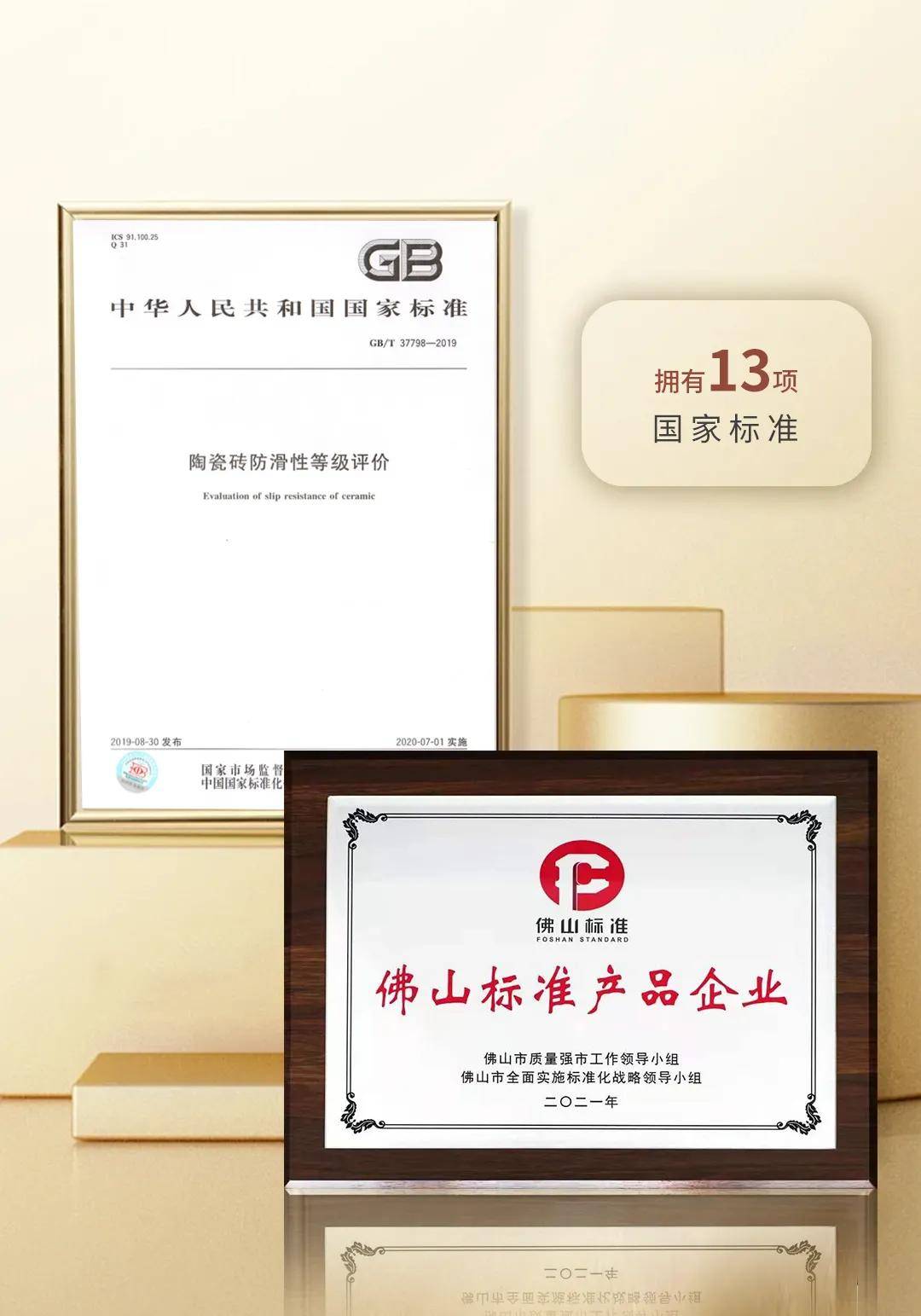 主导或深度参与制修订《陶瓷砖》《防滑陶瓷砖》《陶瓷砖防滑性等级评价》等13项国家标准及3项行业标准,将自身制造体系与工艺精髓,转化为可衡量、可复用的行业公共规范,持续推动产业向透明化、规范化发展。